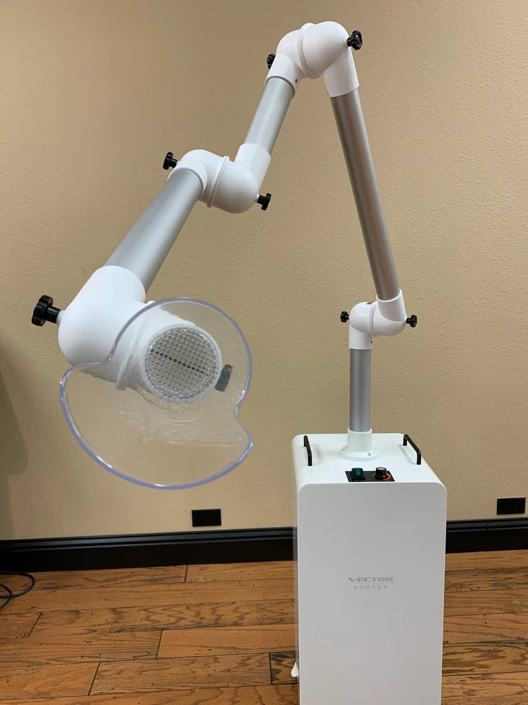 The Vector Vortex Extra-Oral suction device uses high volume Extra-Oral suction to capture, contain, clean, sterilize and kill dental aerosols, creating a safer environment for Dentist, Hygienist, Staff and patients.