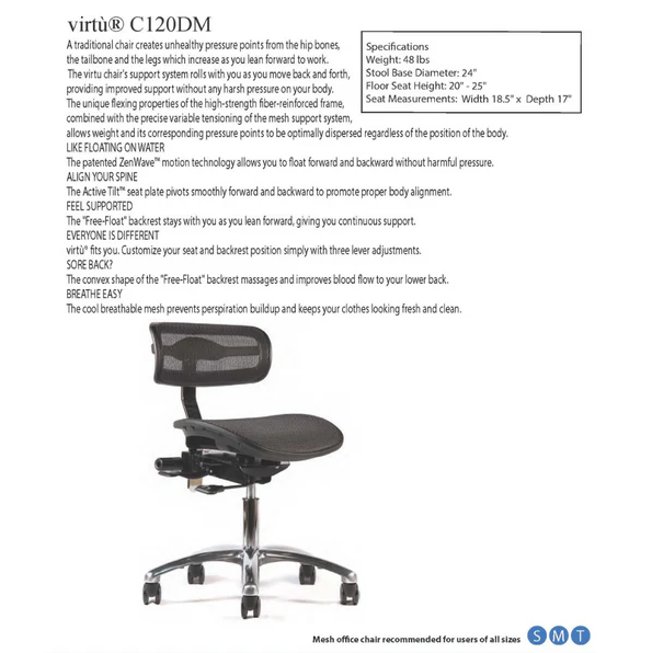 A traditional chair creates unhealthy pressure points from the hip bones, the tailbone, and the legs which increase as you lean forward to work. The virtu chair's support system rolls with you as you move back and forth, providing improved support without any harsh pressure on your body, The unique flexing properties of the high-strength fiber-reinforced frame, combined with the precise variable tensioning of the mesh support system, allows weight and its corresponding pressure points to be optimally dispersed regardless of the position of the body.