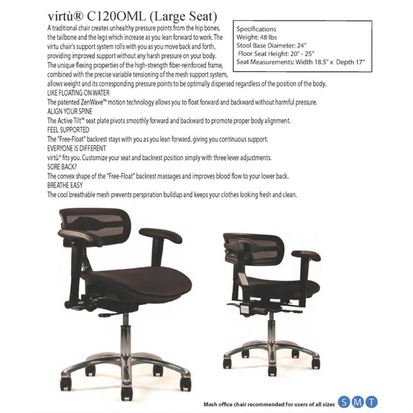 A traditional chair creates unhealthy pressure points from the hip bones, the tailbone and the legs which increase as you lean forward to work. The virtu chair's support system rolls with you as you move back and forth, providing improved support without any harsh pressure on your body,